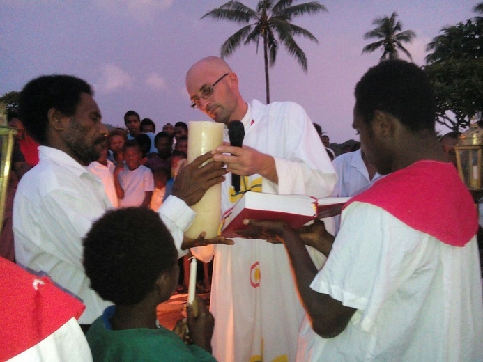 W każdej papuańskiej parafii jest wiele lokalnych kastamów, czyli zwyczajów. – W mojej parafii podczas adoracji krzyża wdowa w czarnym stroju czuwa przy krzyżu, przypominając wszystkim o cierpieniu Matki Najświętszej. W Papui nie ma zwyczaju święcenia pokarmów. – Powiem szczerze, bardzo brakuje mi święconki – podkreśla misjonarz. Nie ma także tradycji procesji rezurekcyjnej, dlatego postanowił ją zapoczątkować. Jak się okazało, tubylcy przyjęli ją z radością. Odbyła się ona przy śpiewie regionalnych pieśni i uderzeń bębnów.