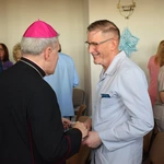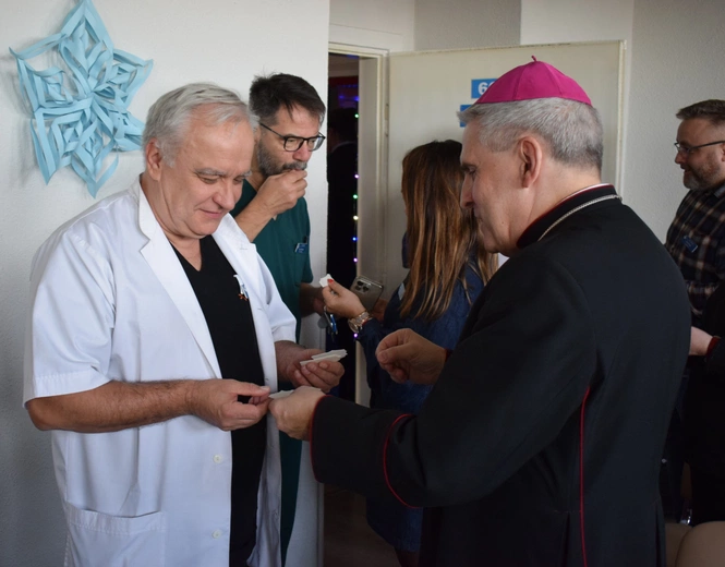 – Przełamanie się opłatkiem jest wyrazem wdzięczności za dobro, jakim dzielimy się nawzajem. Naśladujemy w ten sposób Boga, który dał nam swojego Syna jednorodzonego. Jego wcielenie przeżywa się w szpitalu w sposób szczególny, gdyż stał się On do nas podobny we wszystkim za wyjątkiem grzechu. Odczuwał ból podobnie jak my, a jednocześnie uzdrawiał chorych na duchu i ciele. Wy jesteście specjalistami od ludzkiego ciała, ale dziękuję Wam również za to, że w każdym pacjencie dostrzegacie człowieka – powiedział biskup, a następnie poświęcił opłatki, którymi przełamali się zebrani.