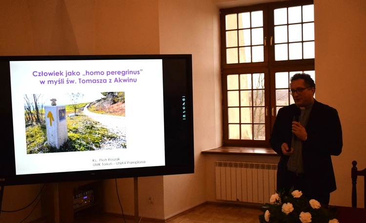 Część naukową spotkania rozpoczął ks. Michał Powęska, rektor seminarium, który w krótkich słowach wprowadził zebranych w temat wystąpienia ks. prof. dr hab. Piotra Roszaka pt. "Człowiek jako homo peregrinus w myśli św. Tomasza z Akwinu – refleksje z perspektywy Camino de Santiago". Prelegent podkreślał pielgrzymi charakter ludzkiego życia, co jest co szczególnie ważne w kontekście roku jubileuszowego wskazującego na konieczność bycia "pielgrzymami nadziei".