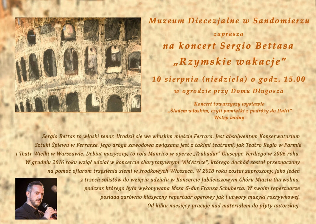 W niedzielę 10 sierpnia o godz. 15 w ogrodzie przy Domu Długosza w Sandomierzu odbędzie się koncert zatytułowany "Rzymskie wakacje". Przed publicznością wystąpi Sergio Bettas – włoski tenor urodzony w Ferrarze, absolwent tamtejszego Konserwatorium Sztuki Śpiewu. Wydarzenie organizowane przez Muzeum Diecezjalne stanowi kulturalne dopełnienie wystawy poświęconej włoskim inspiracjom w sztuce, religii i podróżach.