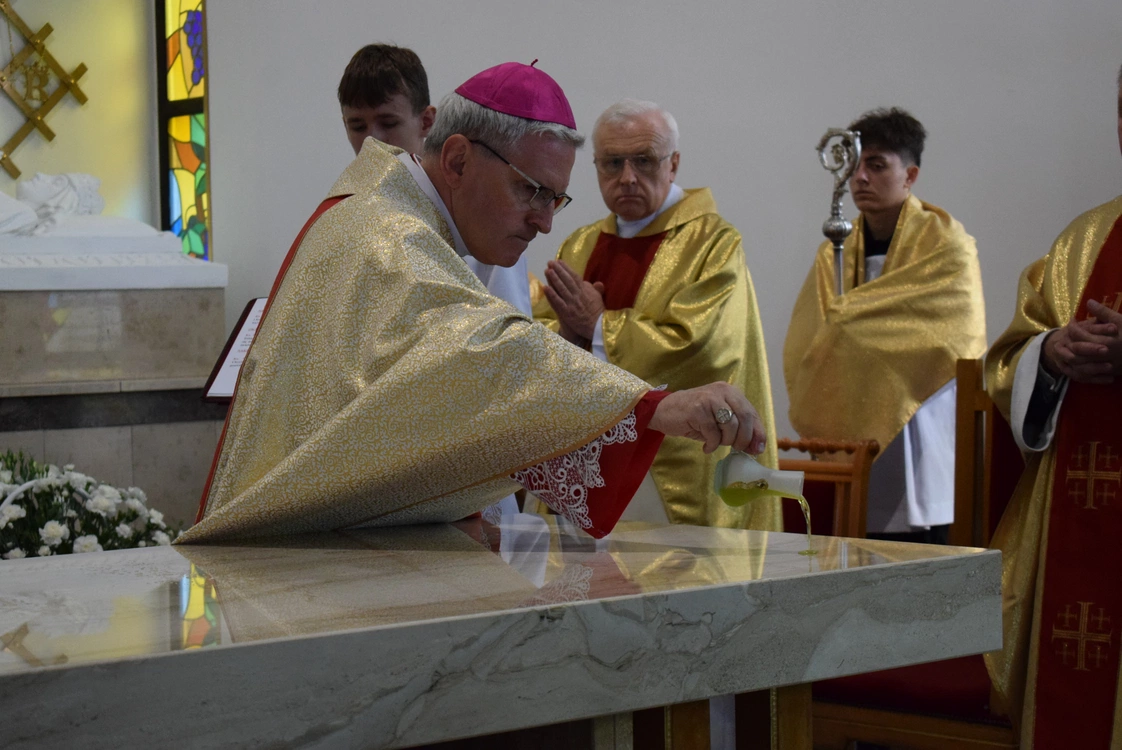 Po homilii i odśpiewaniu Litanii do Wszystkich Świętych biskup namaścił olejem świętym ołtarz oraz ściany budowli, jako znak ofiarowania na wyłączną służbę Bogu parafialnej świątyni. Przez namaszczenie krzyżmem ołtarz staje się symbolem Chrystusa, który przed wszystkimi został "namaszczony" i tak jest nazwany. Namaszczenie ścian kościoła oznacza poświęcenie go dla kultu chrześcijańskiego całkowicie i na zawsze.