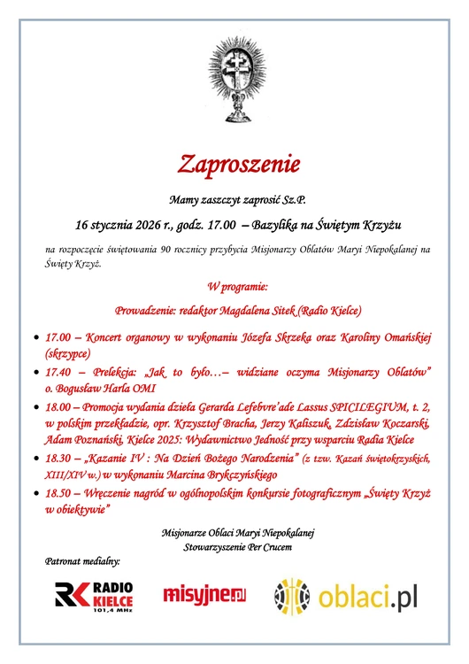Rok 2026 będzie czasem szczególnym – jubileuszowym. Obchody 90. rocznicy przybycia oblatów na Święty Krzyż rozpocznie wydarzenie zaplanowane na dziś (16 stycznia) w bazylice świętokrzyskiej. W programie znalazły się elementy muzyczne, refleksja historyczna oraz promocja nowego polskiego wydania średniowiecznego dzieła "Spicilegium" Gerarda Lefebvre’a de Lassus, jednego z najważniejszych źródeł do dziejów dawnego opactwa benedyktyńskiego na Łyścu.