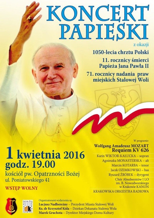 Koncert odbędzie się z okazji 1050-lecia chrztu Polski, 11. rocznicy śmierci Papieża Jana Pawła II oraz 71. rocznicy nadania praw miejskich Stalowej Woli.