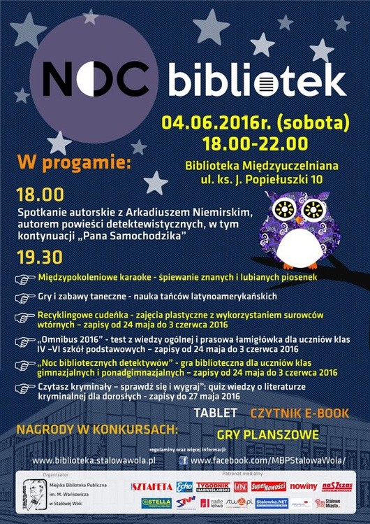 W sobotę, 4 czerwca startuje Ogólnopolska Noc Bibliotek. Z tej okazji sporo atrakcji przygotowała dla swoich czytelników również Miejska Biblioteka Publiczna im. Melchiora Wańkowicza w Stalowej Woli. Będą m.in. gry z atrakcyjnymi nagrodami. Do wygrania jest tablet czy czytnik e-booków. Oto z czego można skorzystać w MBP przy ul. ks. J. Popiełuszki 10.